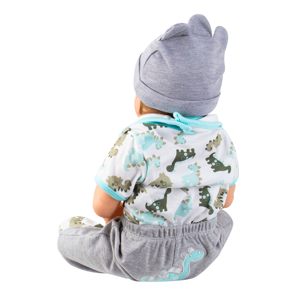 BONECO BABY REBORN V-48 ROUPA CINZA C/DESENHO DINOSSAURO 55CM SILICONE